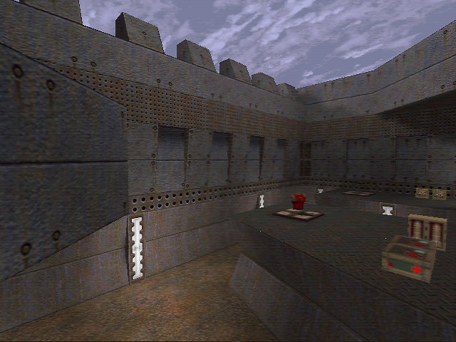 and very shallow supports on the walls, combined with an impressive castellated skyline to give the map visual interest. This gives some fairly impressive architecture, while keeping major designs out of the players way, though a few areas of the map are lacking in appealing designs, and perhaps a bit more eye candy near ground level would be better. There are some good details, with wall lights and grilles, runic corner details, floor numbers on some corners and an industrial striped inset on the top floor. Lighting is fine, with both light