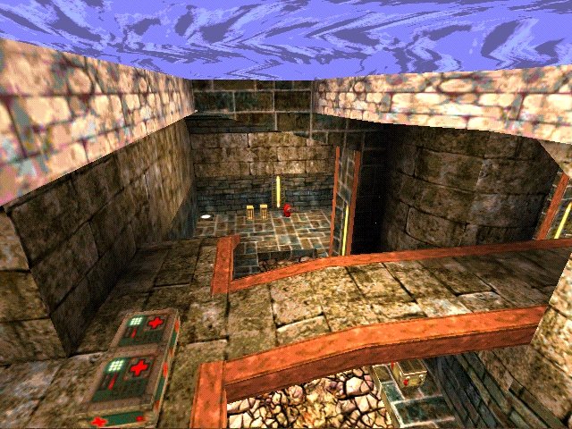 The map consists of two main atriums with various rooms running in a ring around the edge of the map. The two main atriums are separated by a single dividing wall with a bridge running through the wall and onto the pathways at either side of the atriums. There is a Mega Health on top of the bridge in the lightning gun atrium. This coupled with the lightning gun and the central positioning of the atrium mean that this room sees a lot of fighting. Leading off of these two atriums are various corridors and smaller rooms that form a ring around the level. The rooms are a good enough size to provide some interesting combat opportunities but unfortunately the same cannot be said for all of the corridors. While some of the corridors are a nice size others are very cramped and it is easy to get snagged on them. This was a definite problem as getting stuck on the architecture in the middle of a fire fight is not a good thing. It is even worse as it could have been fixed so easily by widening the corridors slightly or clipping certain areas off. I assume this is a legacy from the original 60-minute version of the map (which is also downloadable from [Kona]s site) but one that should not have been overlooked in the process of remaking the map.