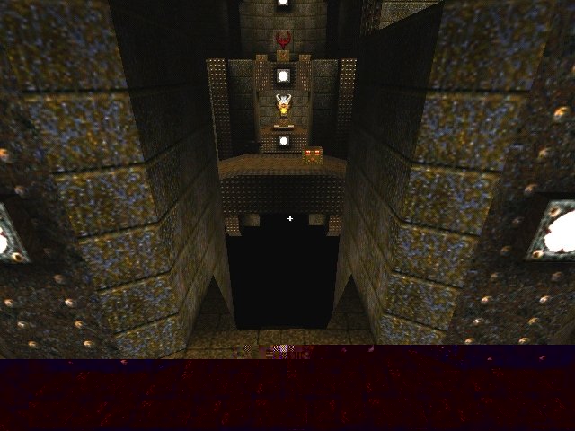 The level is textured in E1M8 style grey brick with metal supports running round the map. It makes a nice change to see a different metal support to the usual one. ELEK has done some nice detailing considering the openness of the level meant that he had to keep a constant eye on the r_speeds, he even moved the lights away from the walls in order to get the maximum detail into the map. The metal supports help add a touch of reality into the map, at least, as real as a stone building floating in a void can get. The supports look like they are actually holding the place together.
