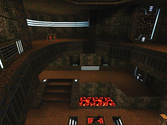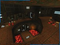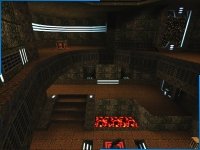 The map consists of two main atriums and a couple of smaller rooms connected together by various corridors and air lifts. It has pools of lava on either side of the main path in the atriums, providing an additional danger during heated matches. Curves are used well, giving the map a very nice architectural style. Despite only having two floors the map has a definite vertical element. This is because of the half floors that NotoriousRay has put in, these are raised areas that provide a slight height advantage to the person standing on them as well as adding more interest to the architecture. The atriums themselves are shaped as elongated circles with a ring running round the edge the top as a second layer. This floor also has raised areas, which makes a nice change from levels where the upper floors are always the same height. The best examples of this are the Quad area, where you have to take the upper path to reach the Quad without a rocket jump. And the atrium with the super nailgun and the rocket launcher in it, where the top ring is raised halfway round, providing a better position for whoever is up there.