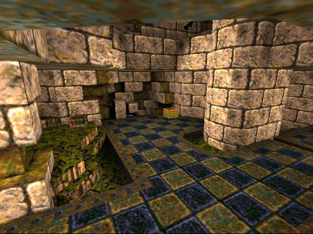 The items are placed so that to get stocked up you need to head towards the centre of the map, as the best weapons are available there, although you can get any of the Quake weapons if you look. Two rocket launchers help add to the carnage in the map and make it the weapon of choice. The red armour is also found at the centre of the map, although it is placed in an alcove on the top floor and must be reached by a rocket jump. Any other armour is found close to the main room with one green armour found in the central room on the bottom level and the other green armour and the yellow armour found just off of it. Ammo is well placed so that you never get overloaded but you dont have to worry about running out too quickly either. There is enough health lying around to keep you at a respectable level without being so plentiful that it is almost impossible to kill someone, like the ammo, a good balance.