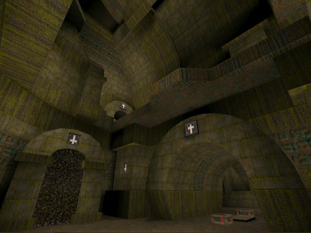 Green, slimy metal, curved walls, huge arches, Q3 stylee. Auhsan arrived in style.