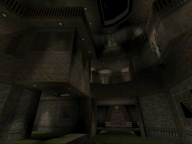 Following in the tracks, style wise, of Headshot's last maps (excluding Dead Bodies everywhere) you have something that looks instantly familiar. Qurnel's take on this is a compact 3-layered atrium with a network of lifts and teleporters transporting you about. A star covered sky breezes across the top giving the map a night time setting. Flood and spotlights are out in force but it all seems a little too dark, with lots of shadowy and overly dark areas.