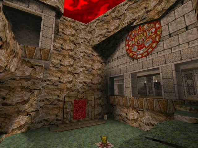 After the high tech piece that was Blackpope's Middle Finger, we have a Meso-American style map set inside a volcano, apparently. Boiling lava and precarious overhangs of land are obvious pieces of landscape to expect. Temple sized rooms with mosaic-patterned floors and rigid rock slab supports are also there to add to the maps visual appeal. Most of the structures in the map are very angular, with not a curve to be found.