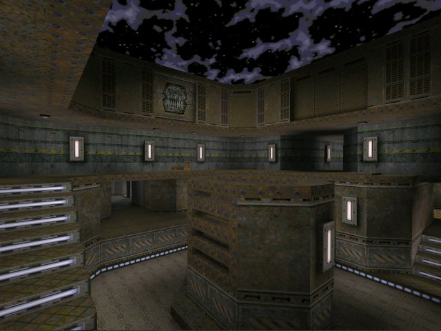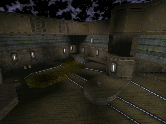 This is an impressive first map from CardO. Borrowing one or two Quake 2 textures gives the map an industrial gritty feel. It's heavily grey and brown coloured what with the diamond brown floor tiling and pseudo-indented grey wall panelling. Its not all doom and gloom though there is a dash of greenery, which can be seen in the maps only outdoor section.