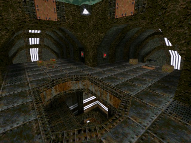 I can't, however, fault the Ogro texture set and Elek's execution of it. The semi-circular steel plated and iron ribbed air tunnels have a certain epic scale about them, and here in lies another problem. Item pickups are placed in the middle, which is good because it's consistent, but bad because I ended up going down past them most of the time (clumsy I am). The rest of the map is equally well decorated. The inner tube is structurally sound, with multiple outer supports coming up and around the walls as if it were some kind of internal rib cage. Strip lighting wraps around the middle level to give a nice constant light source. The slightly dipped crosswalks are another nice touch in this architecturally rich map.