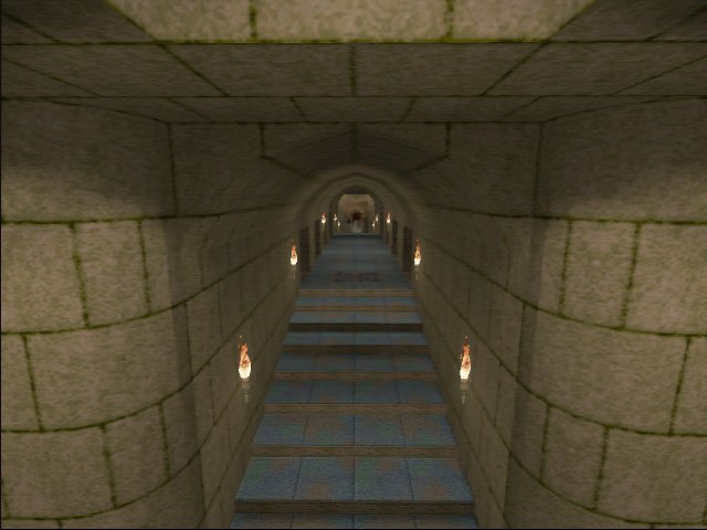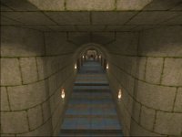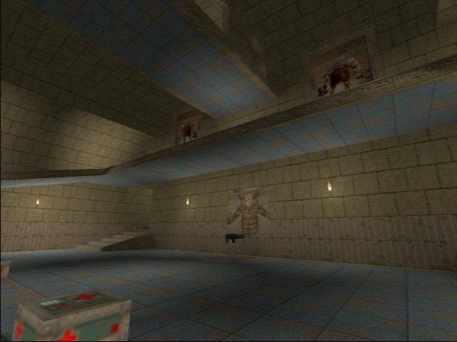 Temple of Osiris is a small 1 atrium map for intense duels that involve strategy and skill. The style is Egyptian with giant sandstone walls and strange text engraved into the trim. Dave Bulow has also created a few custom textures of which only 1 I liked. This was the floor texture, the others he made were screenshots of some of the Quake monsters from iD's maps with a simple crumpled paper effect applied to them.