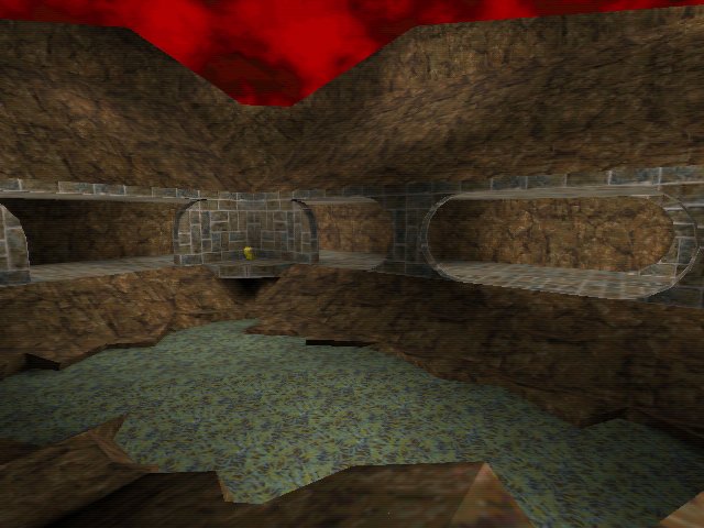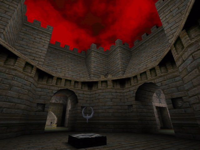 What we have here is a showcase for nearly all the styles of build you can have in a Quake map. The central area is symetrical and takes on a medievil castle look with turreted towers and huge grey bricks lining the walls. At each side of this main area there is an exit or teleport which takes you to a completely different styled location. Theres an underground cave, a curvey rocky (tm) outside area with arched structures in it and theres a strange runic teleporter room where you can grab a megahealth. All the different areas look gorgeous but they cause a big problem with consistency and the map just doesn't feel right.