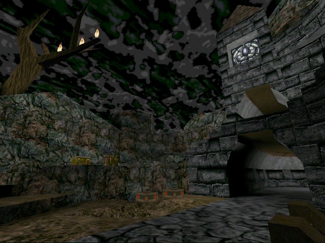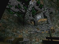 The main indoor area of the map is a sandy-floored L shaped corridor. The roof of which towers upward into an inverted V. Wall mounted torches are covered by crude looking criss-cross bars but the effect of the nicely fading shadows offsets that. I'm also not too keen on the teleporter design. Similar to Bigfoots efforts with the big cylindrical top and bottom and liquidly mass in the middle. Given that they've been placed in specially created spots, a more structurally and visually pleasing teleporter could have been created. But these are minor gripes given that the map plays as well as it looks.