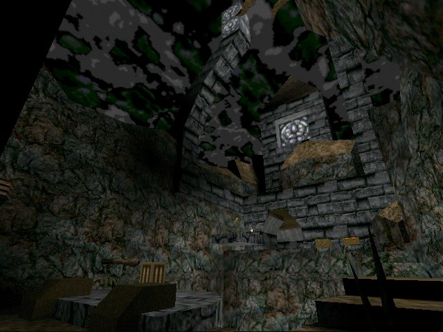 The outdoor architecture is reminiscent of Alice (or Zippie's 100 brushes map) with the tall, spindly towers and patterned window work. The interior is constructed from large grey brick walls that are inset with bookcases tilted at various angles. Most upper areas are broken down and dilapidated with the sky showing above that.