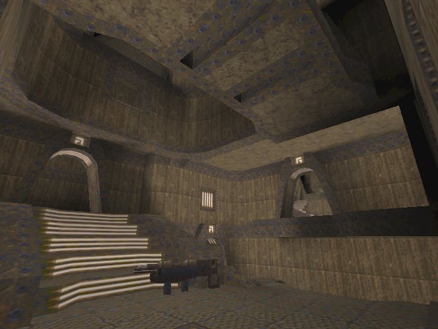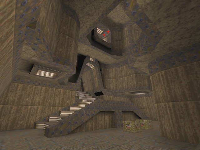 The layout is heavily interconnected and appears to be the work of a deranged mind, not that that is a bad thing, it just means trying to get your bearings is a little hard to begin with. There are some amazingly vertical sections of the map from which you can see acres of playing area. Obvious examples are from the perched MH and Quad positions that sit in alcoves at the very top of their selected atriums. Play is rip-snortingly fast even with a modest player load due to the hopping and jumping down through the various floors as you follow/run away from your opponents.