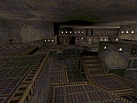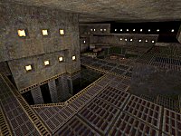 The map consists of one large three-story atrium with a pillar in the middle and one or two pods off the side. The upper two-thirds of the walls and ceiling are solid concrete with lots of recessed lights, giving the place a decidedly morbid, "sealed in" feel. (Paul reckoned the sky was missing, but then this map wouldn't feel as oppressive.) Floor panels are boxed in with brown metal edging; this looks nice and understated. Minimal and yummy.