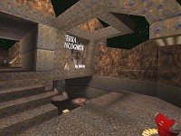 What a mix of inspirations for Misyu's first double digit map. Bal's "Dying Embers" (Baldm8) is the most obvious for the open topped rocky formations on the up most levels and the curving ironwork over the RA. The textures are a grim coloured mix mostly from Quake 2. There is the obligatory whirring and grinding noises from the wall mounted computer consoles and an unusual amount of signs and notices. A little more emphasise on detail would have been nice since it's a bit sparse in parts.