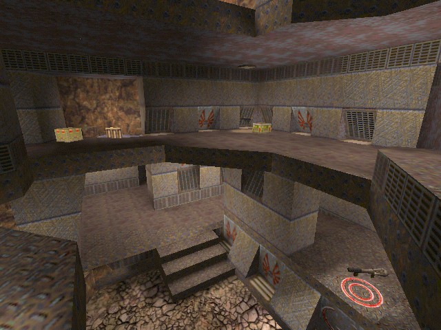 It does however play better than it looks. The layout is loosely based on DM4 except without the lava, thankfully. Its been designed to work best for duelling and it certainly manages that. The layout is pretty well interconnected with the slick drop down to the MH and the circular upward path through the map. I did find at times in 1-on-1 that ammo was infuriatingly low because there would be the odd occasion when I was going in for the kill and I'd then run out of ammo leaving me in the shit. This became a problem when the game was very close because you'd have to retool again to get ready. FFA is livelier but for me wasn't as enjoyable because it seemed too packed and cramped.