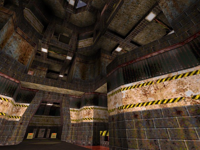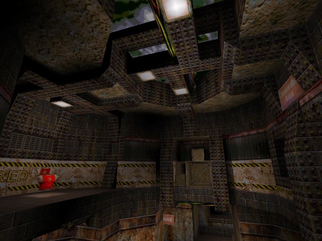 The layout is built around a three-layer skyward looking atrium. The encompassing layout is bit disjointed with no real path of smooth movement. Lots of lifts, ladders and teleporters intervene here and I thought this would make for very jumpy play. To a certain extent it does but its very on edge, keep your wits about you stuff. You'll have to keep your eye on the ball, so to speak, to rack up those frags. For me this type of play is enjoyable for 15-20 minutes after which it gets on my wick and begins to annoy. Playing it for short bursts worked best.