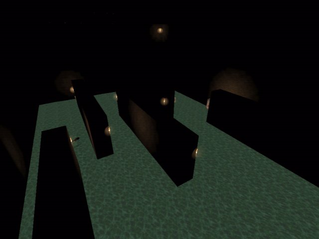 What we have here ladies and gentlemen is a glorified boxmap. One room with various walls jutting out of the sides to create a little maze like arena. the only deviation from this "box" is a small corridor in one side with two rocket launchers in it, one at each end. Lighting is not fullbright, pretty much the opposite with almost complete blackness in the main area, the little corridor is a lot lighter though...
