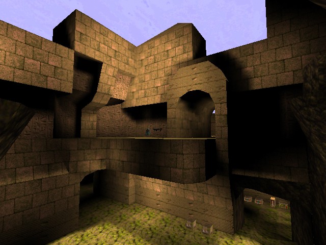 It's a fairly small map with a rectangular ring for the ground floor and a J shaped layout for the first floor. There are a couple of teleporters on the ground floor which drop you off to the far ends of the upper level, whilst the third is situated on the top floor and simply returns you to one of the other teleporters. Play is pretty brutal and on a couple of occasions I was being turfed about all over the place, landing on the rocky outcrops to the up most sections of architecture due to the close quarters rocket fire. It's a real blast to play.