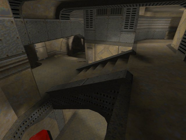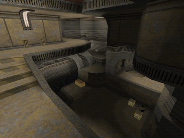 The maps layout is great with the spiraling and curving corridors meeting up in atriums which descend into murky blue water. item placement is also very good and lends a great balance to the map as a whole. People who like there powerups will also get on fine as there are 2 invisabilities, a quad and pentagram! Luckily all of them are very hard to get and require a lot of searching and skillful rocket + grenade jumps in some situations...