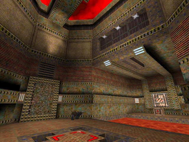 The lower bowels of the map are rather high and are just about rocket jumpable if need be. Clipping is good although I got buffeted about a bit until I got my bearings. Since the map isn't that big a low player load is more suitable.
