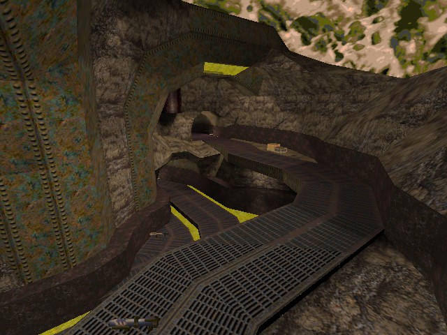 Visually its excellent with the mix of industrial style textures and grubby rock. In the play stakes it doesnt hold up quite as well. Even though the layout does spiral outwards meaning it flows quite nicely, most sections are just two levels making it rather flat. As such I found it a bit monotonous after a while since Id just jump back and forth between the teleporter next to the MH and its exit near the RL and RA. It does however seem better suited for duelling than for FFA. The map is relatively small and when playing indoors with larger numbers it becomes a little hectic.