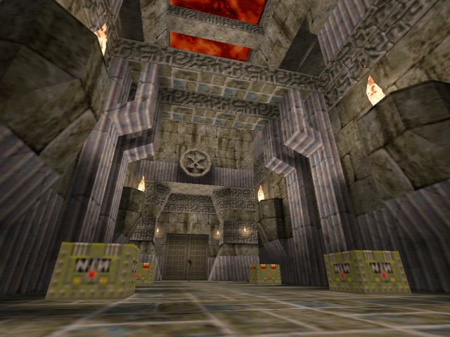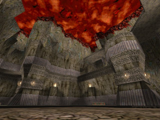 Well, we've been getting a whole load of original looking DM maps at Qexpo, and XeNoN continues this fashion with "Deceit". A huge temple built into the side of some fleshy cliffs, complete with blood rivers cool shadows coming off of the blood red sky. The lighting is great and the maps suck atmosphere chills you as you frag.