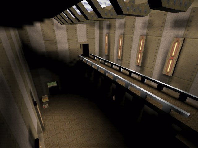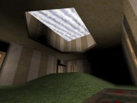 Unfortunately gameplay isn't too good either. The horrible full dark areas combined with numerous clipping problems means that you cant see and get caught on the sides of doors and walls quite a lot. In the authors defence, item placement is quite good with the rocket launcher in the center of the outside area and the grenade launcher up on the bridge in the inside area.