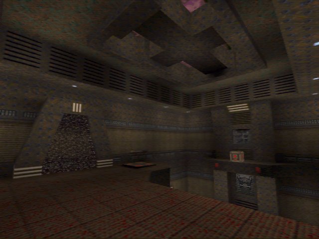 Not a hint of crimson in sight here. What you have here is the ZtnDm4 wall texture blended in with red brick and metal textures. Also you'll notice the Dapak style teleporters. The architecture is highly detailed, but this could be partly to do with the textures used. The layout centres around a very vertical main artium which consists of 4 layers. Progression up these levels is via stairs and teleporters.
