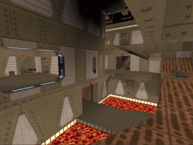 Looks aside it played ok. At times the layout seemed to stop play from running particularly smoothly. I had no problems, but the bots looked like they'd all eaten a can of mexican jumping beans each because these guys were jumping all over the place! They'd bounce of the upper platforms, then try to jump back up, miss and fall into the lava. I've never seen them act this mad.