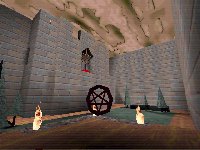 So after eventually getting my hands on this map, is it any good? To honest, no its not. Theres some nice ideas in there but theres also some equally bad ideas. The area shown in the left hand shot is actually from Shim3, in Shim4 theres a ramp against the right hand wall. Also the pentagram of protection isn't there. What is there though is an invisible teleporter! Also the wooden platform which can be seen around the bottom of the castle building is a lift. Not a little part of it. The entire section is lift.