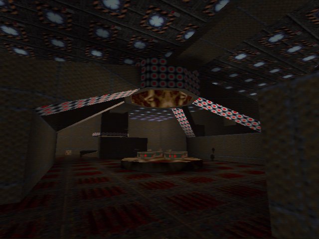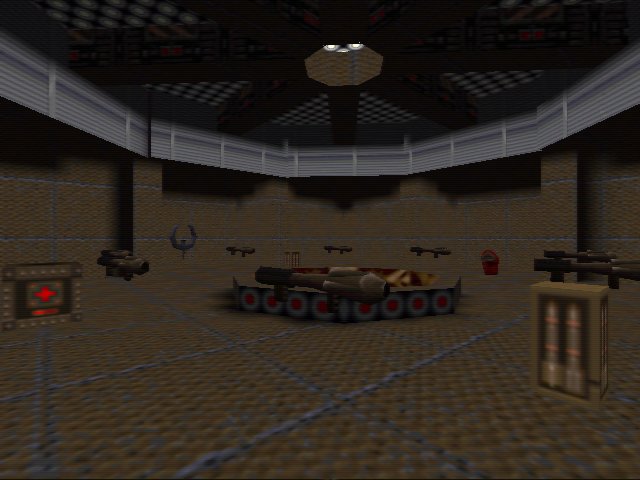 The layout of this map is very simple. You have a room (shown in the first screenshot) containing a load of RL's. Theres also a load of player starts in here as well. Anyway, theres tunnel in the centre of the room which drops down to a big room with various obstacles in, which can be seen in the second screenie. The rooms are also small and cramped. Texturing is messy and some of the textures clash badly.