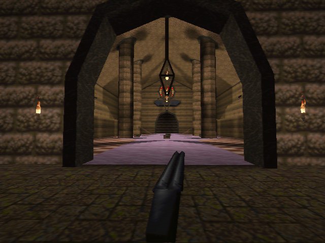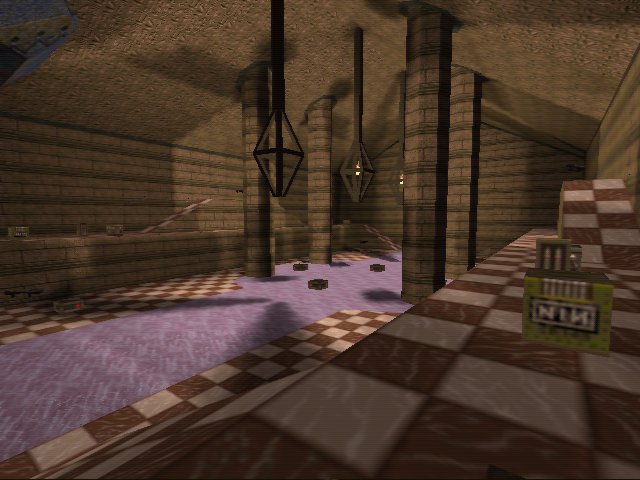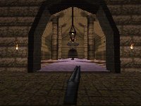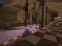 A much more enjoyable map. Again the layout is simple but it provides much more space for you to play in. What you have is a big building with an outer walled area. The architecture is a little simple but its textured well. Lighting is so so. Inside the hall it looks all sourced but its a little too bright. I mean since when does a flame give off the light intensity of 60 watt bulb? Never is the answer.