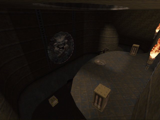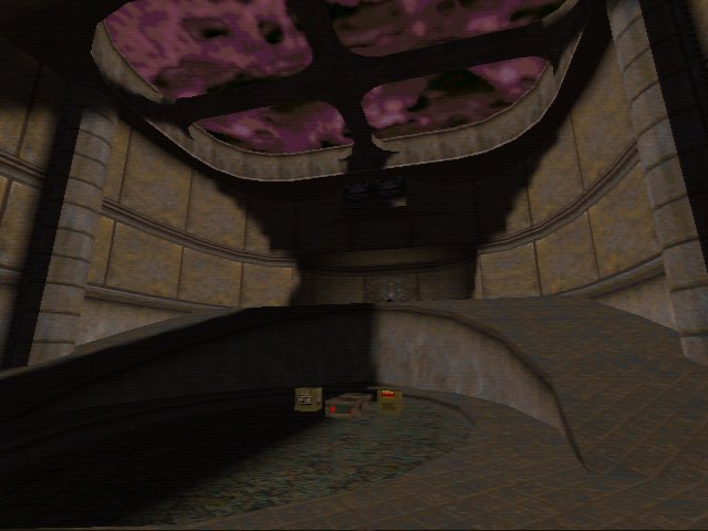 Renegades second Quake map is a vast improvement, in terms of looks. All the walls and surfaces are curved and it looks really cool. Most of the map is set indoors. Lighting is a little on the dark side, with some areas almost pitch black.