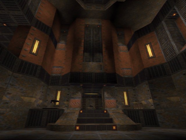 Danny mixes some Quake 2 textures in with this really cool looking Orange metal textures. These are used to create a high tech looking base map which I think looks brilliant. The map circulates around the central room shown in the first shot. There are three very well connect levels which then go around this main room.