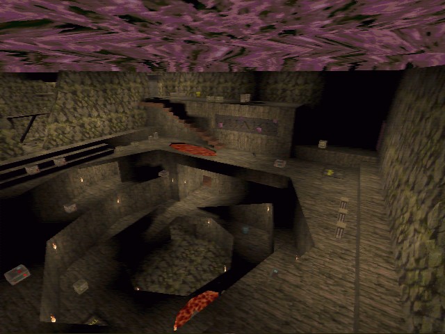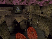 differ in layout. One has an upper rock ledge surrounding it with a temple like entrance at the bottom with a couple of pools of lava (right hand shot). The other room is basically a pit (left hand shot). Interconnecting these two rooms area sprawling mess of player wide