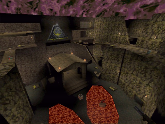 What disappoints me more is that three major power ups are also within very close range of easy other. In the temple entrance area you can drop down from the upper ledge on a pentagram of protection then across the room to the Quad, which is in the temple area, then back track a little and rjump onto the temple roof to get the ring of shadows. This makes it easy for someone to rip round, grab them all and really kick some ass. If would have been better if their placing was a little more scattered.